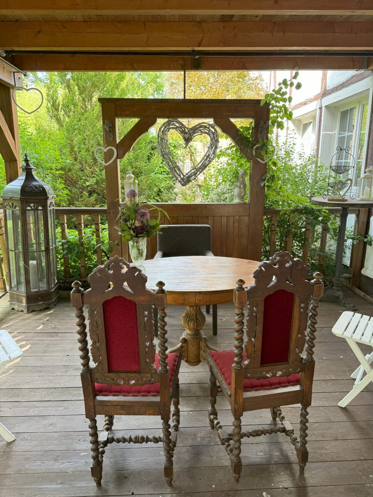entspannte Atmosphäre im Garten, eingebettet in Wald und Weiden, als natürliche Traumkulisse.