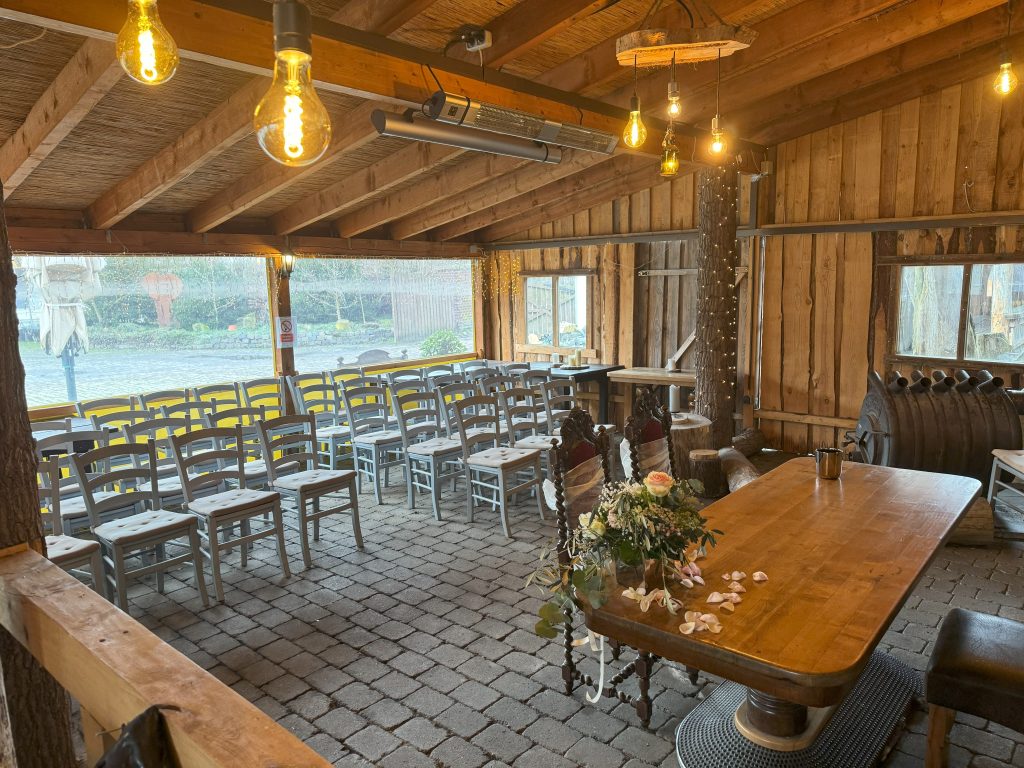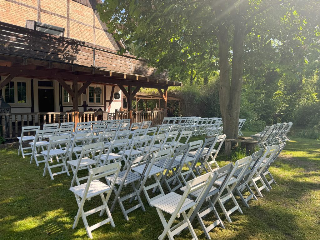Bis zu 120 Gäste (stehend und sitzend) können es sich während der Trauung im Garten gemütlich machen und der Zeremonie entspannt unter freiem Himmel folgen. Eingebettet in Wald und Weiden, bietet dies natürlich eine ganz besondere Kulisse.